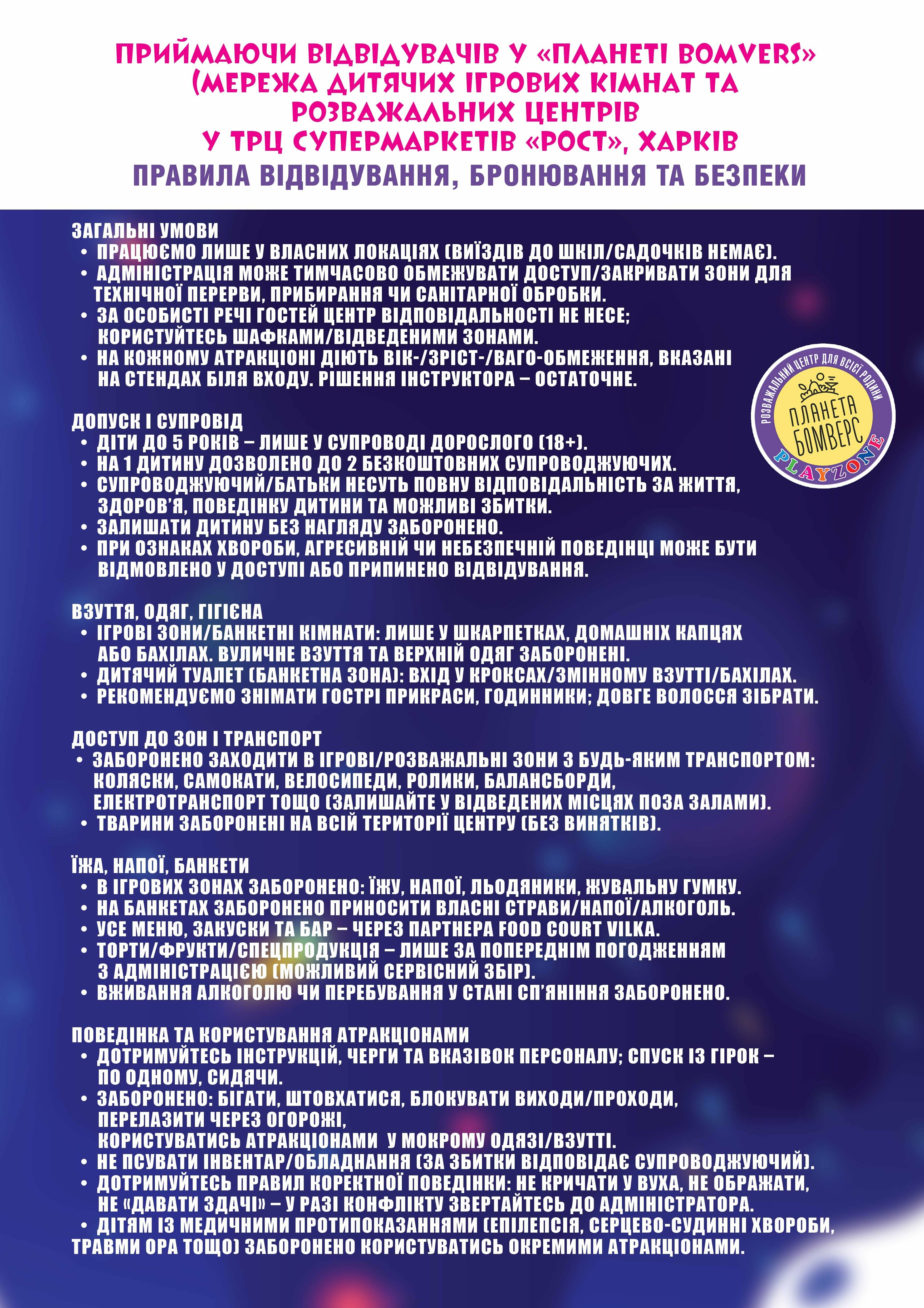 Розважальний комплекс PLAY ZONE Планета БОМВЕРС залишає за собою право відмовити в наданні послуг на свій розсуд без пояснення причини.